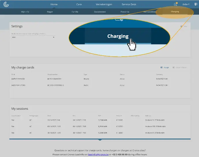 Stap 1: Log in op MyCronos Open de MyCronos applicatie op URL https://mijn.cronoscentral.be/home, log in met je Cronos gebruikersnaam en paswoord, en klik op het tabblad “Charging”.