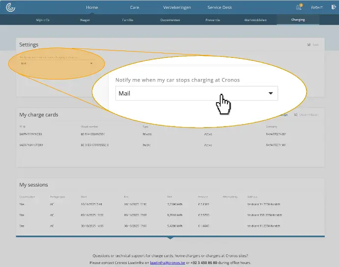 Stap 2: Activeer meldingen In het “Settings” menu kan je de optie “mail” aanduiden. Zo ontvang je een email wanneer je wagen stopt met laden aan Cronos laadpunten (bijvoorbeeld te Kontich). Dan kan je wagen tijdig verplaatsen wanneer hij volledig opgeladen is, en geef je je collega’s ook de kans om hun wagen op te laden. |